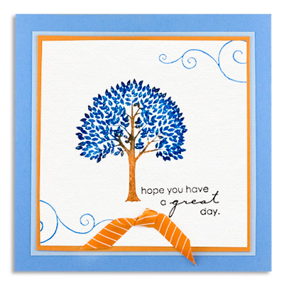 Ink tree stamp with tea dye on the trunk and cobalt on the leaves. Stamp on white card stock. Stamp words on cardstock with black versafine pad. Stamp scrolls with cobalt on top right and bottom left. Assemble card and add glitter glue.