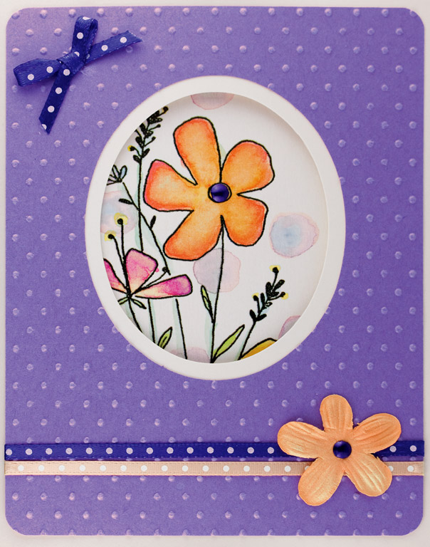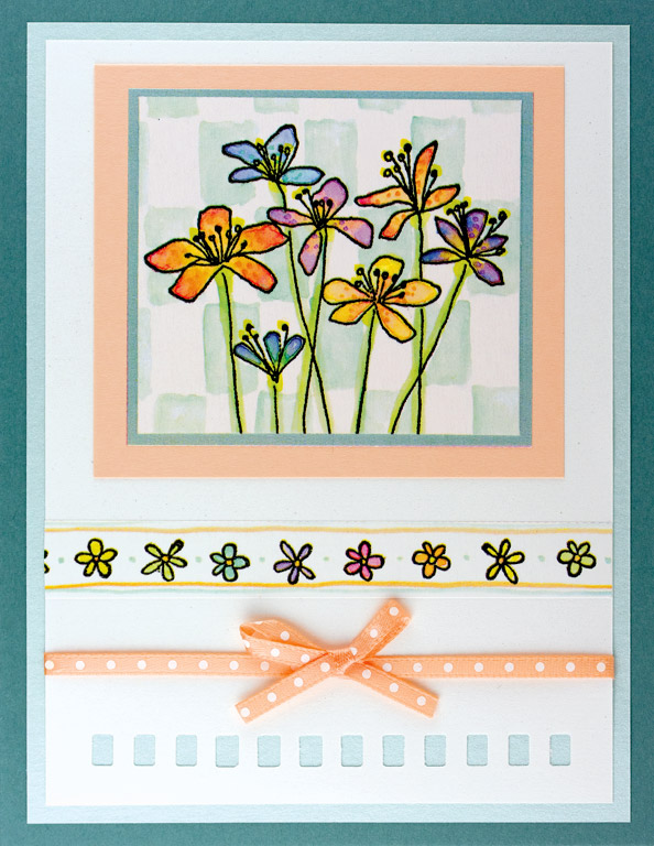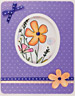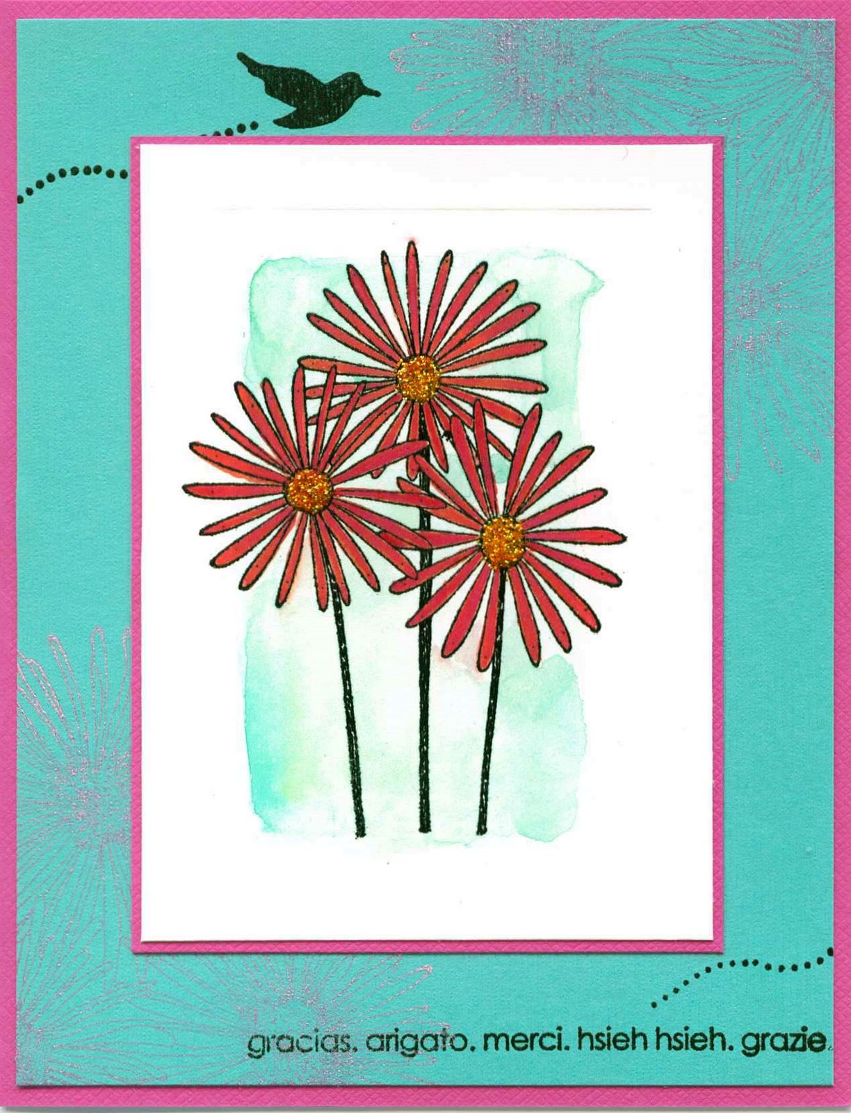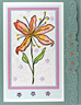 Stamp flowers with black and emboss with clear. Watercolor a rectangle background behind flowers using green and teal. Watercolor flowers with red. Paint over the red with the coral berry. Stamp large flower heads on background with orchid. Stamp birdand words with black. Assemble card and add glitter glue to the flower centers then pour orange crush glitter over that.