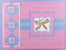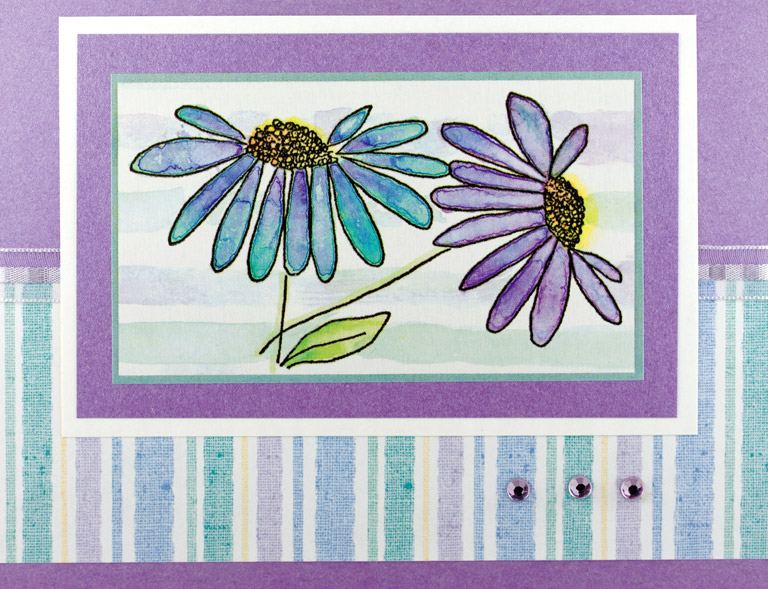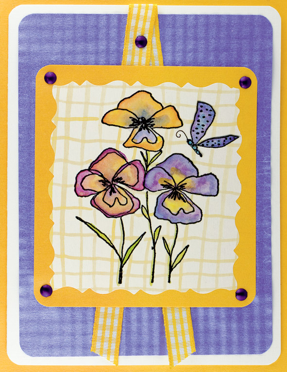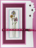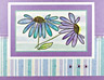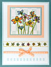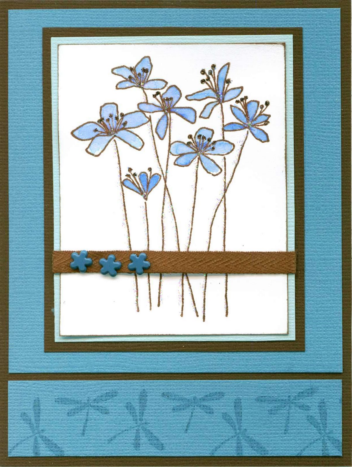 Stamp the flowers with sepia versafine and emboss with clear embossing powder. Color flowerswith #3 blue (Marvy marker). Stamp the dragonflies with Versamark pad. Assemble card and add Star dust Stickles.