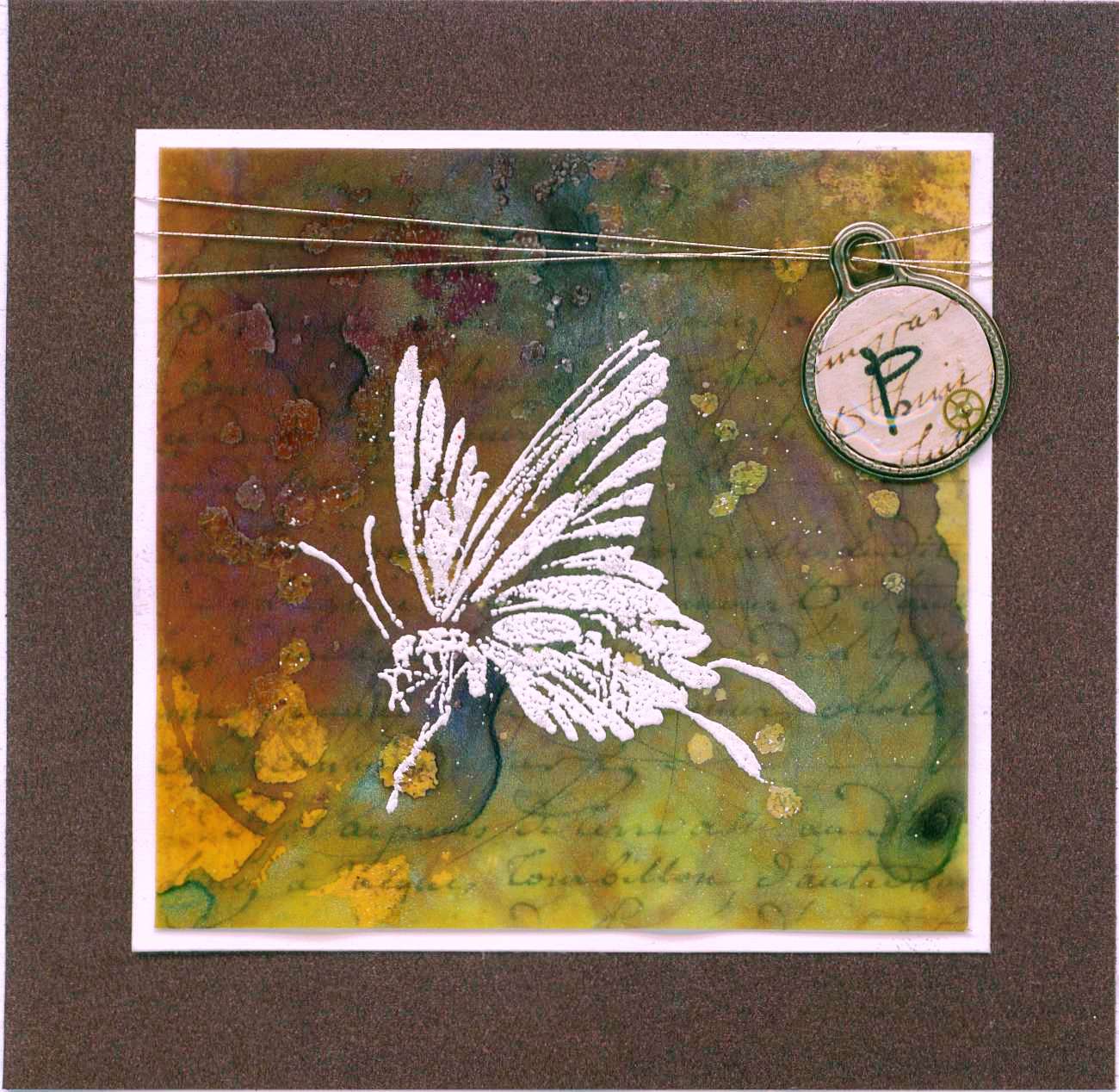 This card was done with the left over sheer heaven paper that I used in the card in the last post. On top of the paper I sprayed more Tattered Angels glimmer mist in deep plum and meadow green. I swirled the wet color around with the end of my paint brush and let it dry. Then I stamped the butterfly (3359f flutter) in white and embossed with white. The sheer heaven is like vellum so it is sheer as it sais and so I mounted it over Penny Black paper - Antique script 70-043. I then mounted that to white card stock. I used a blank charm from 7 Gypsies and cut out a circle of the Antique script and stamped a P from the 20-006 Kate text lower case set. I mouted it into the charm and added diamond glaze. When it was dry I wrapped a metal thread around the butterfly piece with the charm and then assembled card. The cardstock used is actually a metallic eggplant color. The sheer heaven also has a mettalic sheen from the TA spray but it doesn't show in the scan. Angela