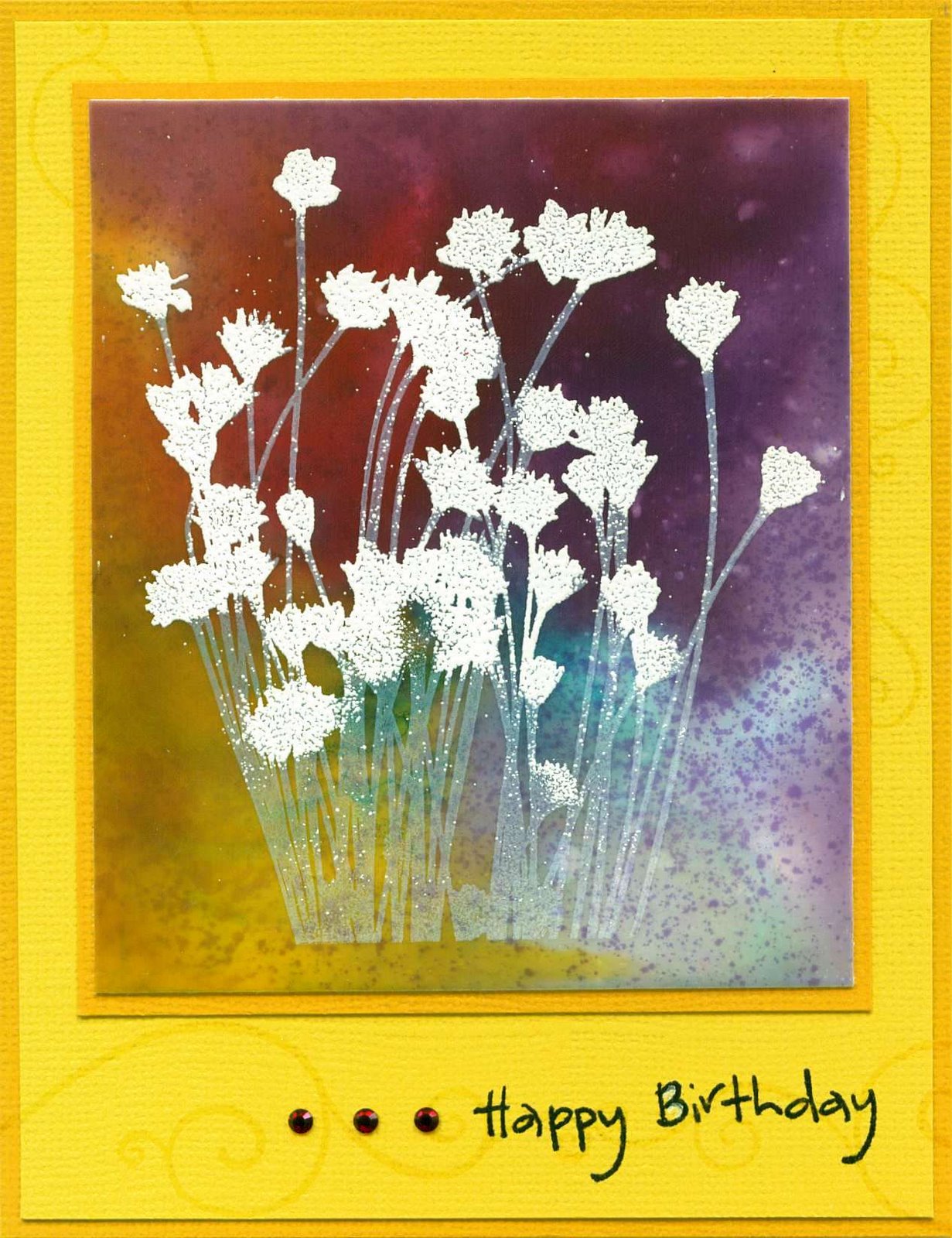 So first you will need to lay out your craft sheet and put away anything you don't want to get ink on. Cut a piece of sheer heaven down to about 4 x 5 inches. You will spray (keeping the sprayer right up to the craft sheet to prevent overspray) one spritz for each color on the sheet. Keep the colors separated but not too far apart. Maybe not more than one inch. Spritz the color with water. Spray your sheer heaven (on the satin side not the glossy side) with water. Lay your piece over the ink and spread the ink around by rubbing the paper. Before lifting it up heat it a little with your gun. Lift up paper, spritz a little of the glimmer mist over the piece and set aside to dry. You can take chroma coat white paper to soak up the rest of the ink and use in a later project. When your sheet is dry stamp the flowers with white add white embossing powder to the flower heads and emboss. You can take a paint brush and wipe off the embossing powder from the stems before you emboss. Stamp the scroll stamp with versamark on the yellow cardstock. Stamp happy birthday with black. Assemble card and add rhinestones. If you have any questions I will be checking your comments and get back to you asap.